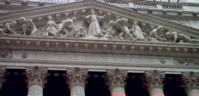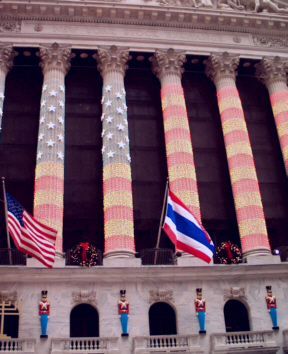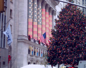 The capital of the western capitalist world, the New York Stock Exchange on Wall Street. Here it is decorated for Christmas.