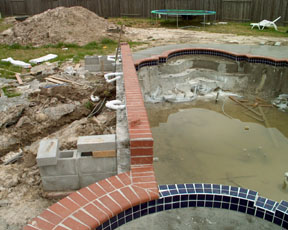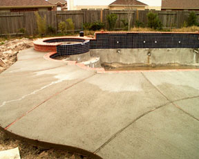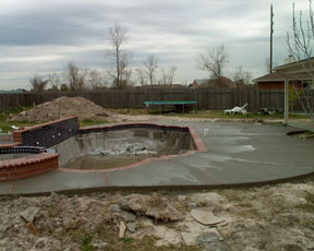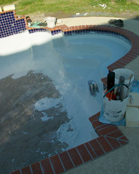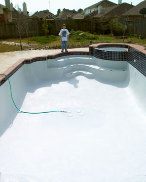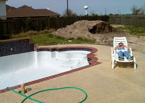 Next came the plaster. It looked a lot like they were spreading icing over the cement. But it works. That day, after they had plastered all morning, we began to fill the pool. It was about 60 degrees that day but as you can see, Harrison is ready for a swim. Since it took another day to fill the pool, Harrison had to settle for a lounge chair. |
