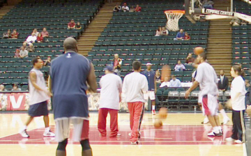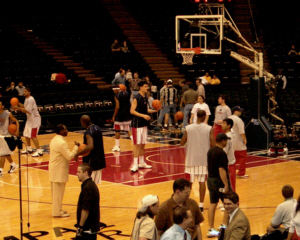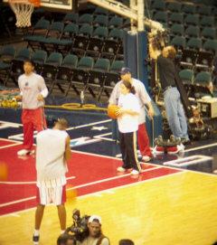 Below right, me with the ball, waiting for Mo Taylor to take the shot. Oh, yeah, I also smacked Steve Francis in the head with the ball during warm-ups. Yao was cool, he talked to me but Steve Francis was not cool at all.